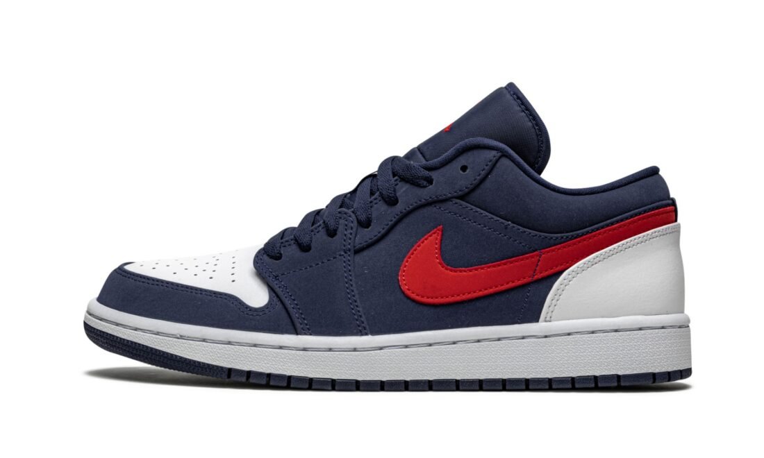 The Air Jordan 1 Low SE “USA” is a patriotic colorway of Michael Jordan’s first signature shoe in the popular low-top style. Jordan Brand’s dedication to elevating the Jordan 1 Low into the upper echelons of sneaker culture has seen the brand use the model in collaborations with Dior and Travis Scott since 2019. Here, the “USA” adds to the impressive assortment of Jordan 1 Lows by featuring the red, white, and blue color scheme of the American flag. A Midnight Navy suede material appears on the forefoot, mid-panel, collar, and eyelets. The University Red leather Swoosh logo on either side of the shoe breaks up the look. White leather can be found on the perforated toe and on the heel. A red embroidered Jumpman is stitched onto the navy blue nylon tongue. Finishing touches include a white rubber midsole and Midnight Navy outsole.