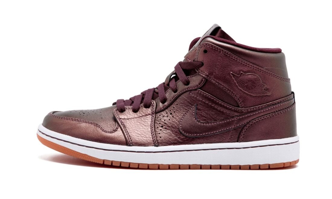 The Air Jordan 1 Mid Nouveau is featured here in a slightly iridescent Deep Burgundy upper with a gum rubber outsole.