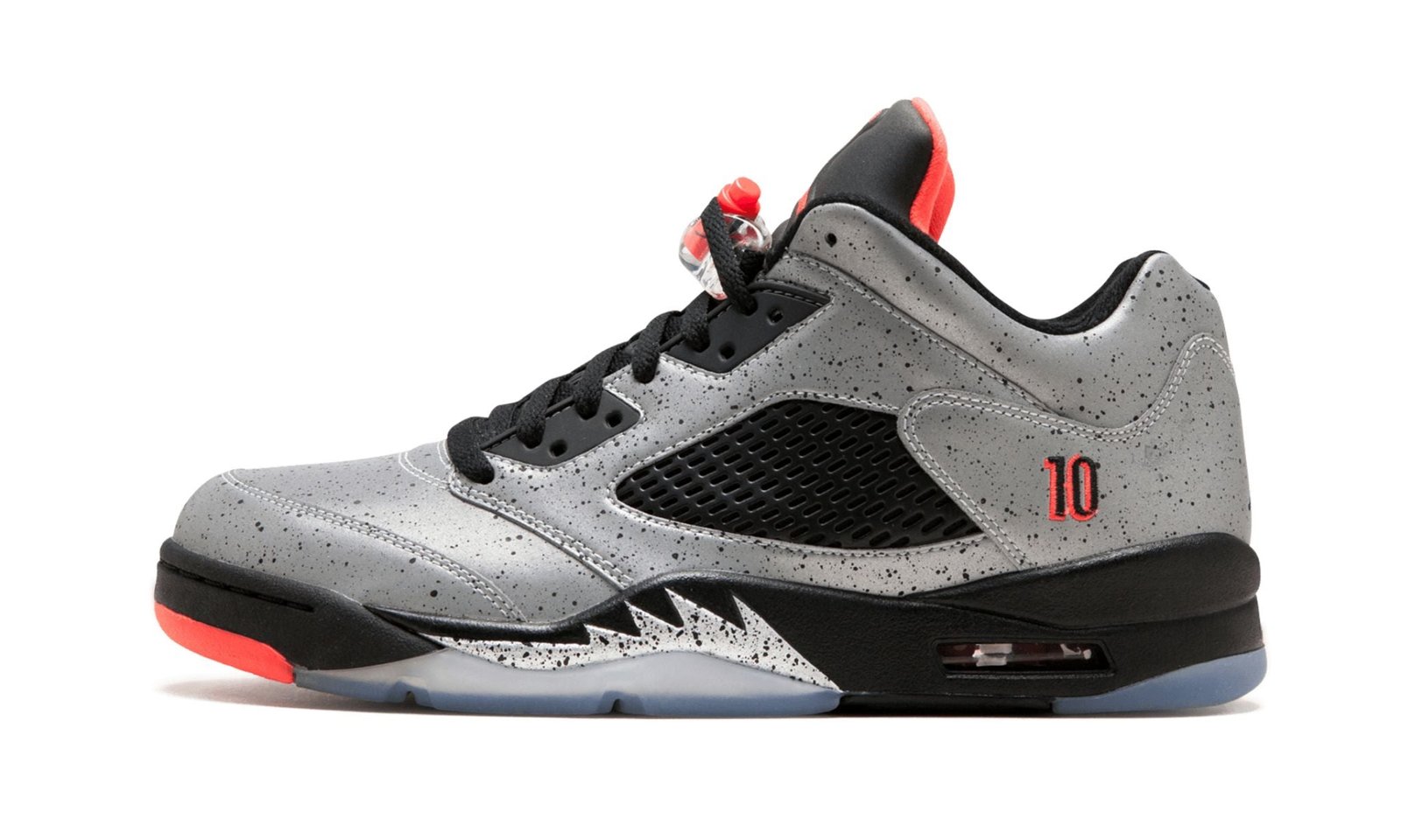 In 2016 Jordan Brand collaborated with Neymar to create the soccer superstar’s very own colorway of the Air Jordan 5. The flashy look features a fully reflective silver upper covered with speckles while black and Infrared add the accents.