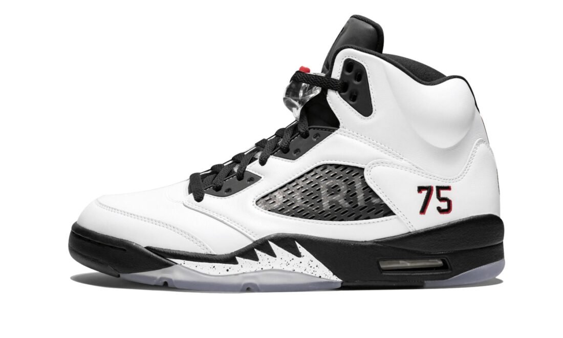 White and black leather Air Jordan 5 Retro sneakers from jordan featuring a round toe, a lace-up front fastening, an oversize tongue, a flat sole, a jumpman logo at the tongue, a stitched number 75 on each heel and transparent mesh side panels. These styles are supplied by a premium sneaker marketplace. Stocking only the most sought-after footwear, they source and curate some of the most hard to find sneakers from around the world.