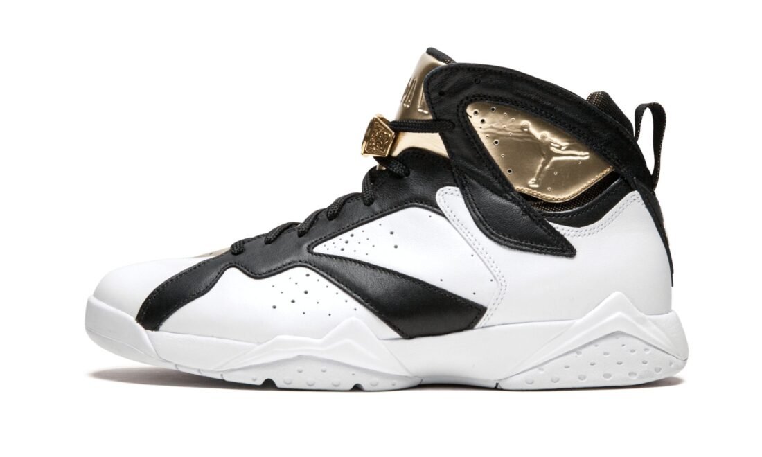 Half of the Air Jordan 7 “Champagne and Cigar” pack celebrating Michael’s second championship with the Chicago Bulls in 1992, this Champagne colorway features a high quality leather upper in black and white with gold accents. Special ring lace locks finish off the premium celebratory look. u003Cbru003E
